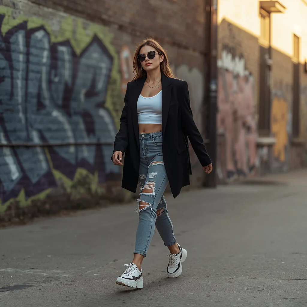 Picture this: your favorite vintage band tee, distressed mom jeans, and an oversized black blazer thrown over your shoulders. Add some chunky white sneakers and oversized sunglasses, and you’ve got that model-off-duty vibe everyone’s chasing. The juxtaposition of formal and casual elements creates that perfectly imperfect balance.