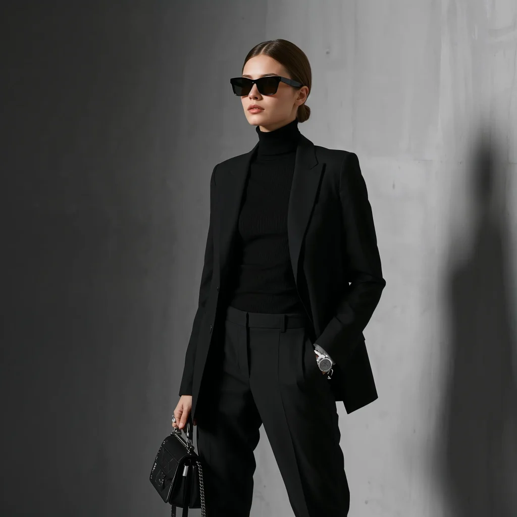 Start with black straight-leg trousers and a black silk blouse. Layer your blazer on top, ensuring each piece has a slightly different texture to avoid looking flat. The magic happens when you play with proportions – try a cropped blazer with high-waisted pants or an oversized blazer with fitted pieces underneath.
