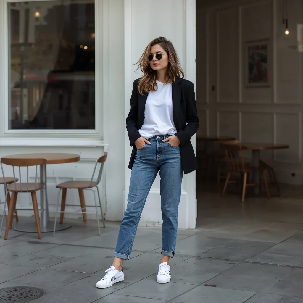 Start with tailored joggers or sleek athletic leggings. Add a fitted tee and your blazer, then finish with clean white sneakers. The contrast between sporty and sophisticated creates an interesting tension that feels very now.