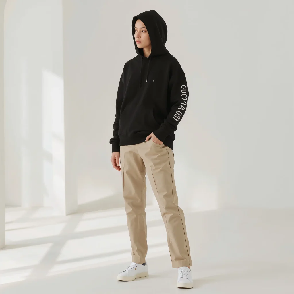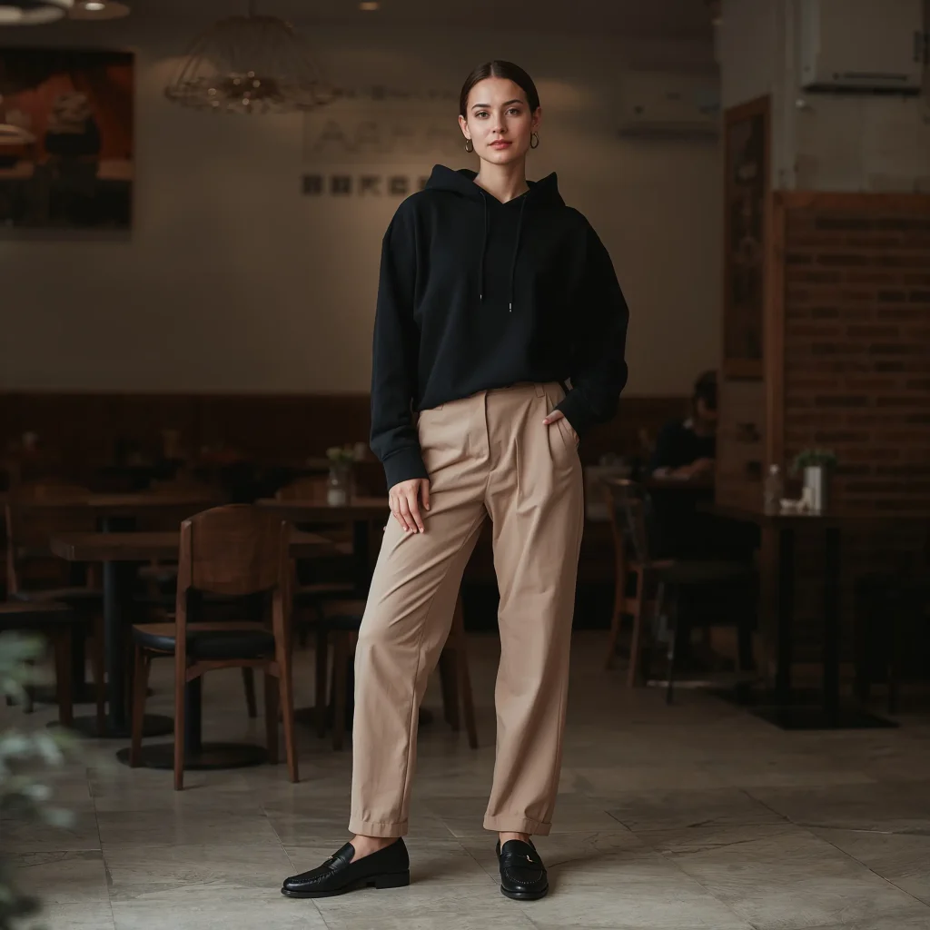 Start with a fitted black hoodie – none of that oversized business here. We’re going for sleek and streamlined. Throw on some high-waisted tailored trousers (yes, really), and suddenly that hoodie looks intentional, not lazy. I discovered this combo by accident when I had a Zoom meeting and realized my sweatpants weren’t going to cut it.