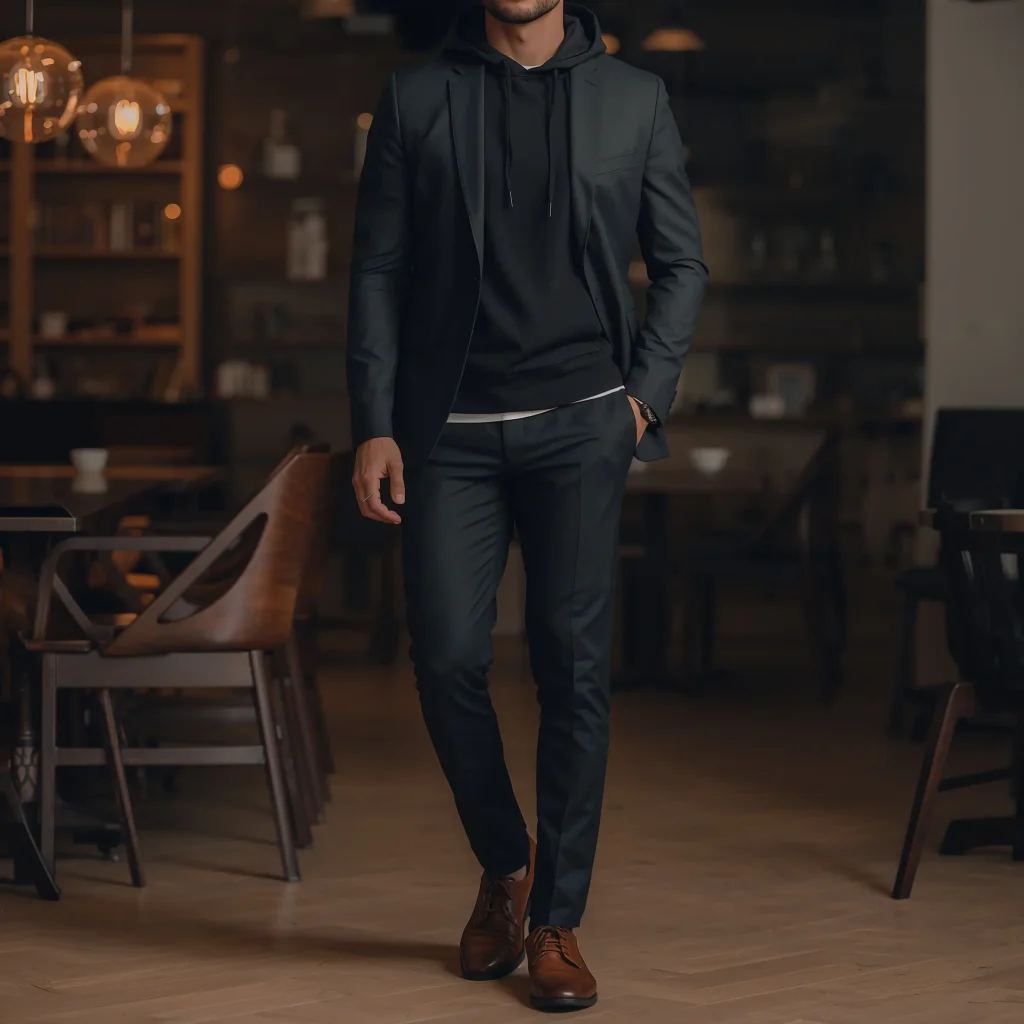 Pro tip? Keep the hoodie relatively thin and fitted. Nobody wants to look like a marshmallow stuffed into dress pants.