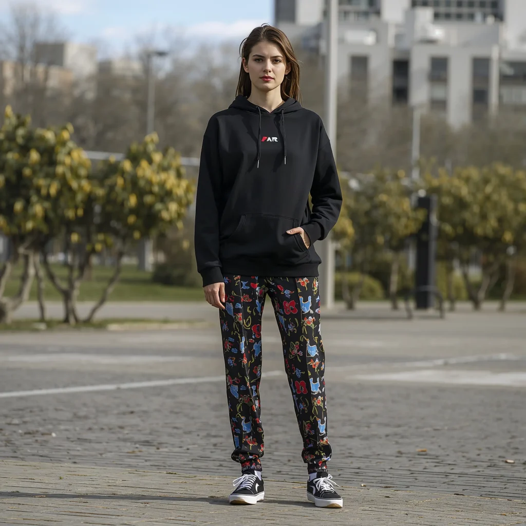 Printed pants with a black hoodie? It’s easier than you think. The solid black hoodie acts as a neutral canvas, letting your printed bottoms take center stage. Camo, plaid, florals – they all work when you keep the top simple.