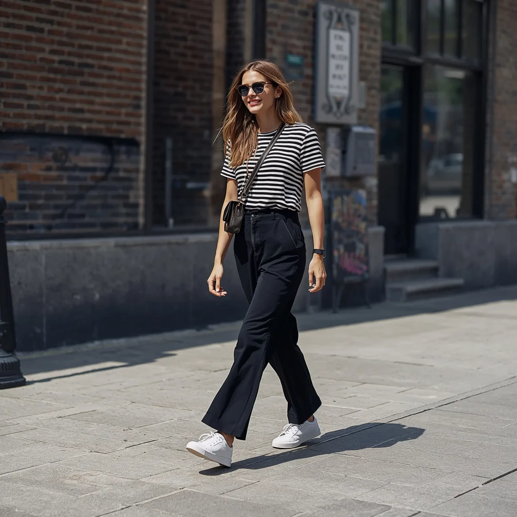 I stick to a palette of black, white, beige, and gray. A simple white tee, perfectly tailored pants, nude mules, and a structured bag. That’s it. The magic is in the fit and quality of each piece.