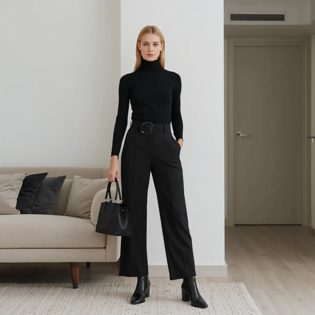 I pair mine with a black silk camisole tucked in, layer a black oversized blazer on top, and finish with black leather accessories. The trick is mixing textures – matte, shiny, knit, leather – to create visual interest without color.