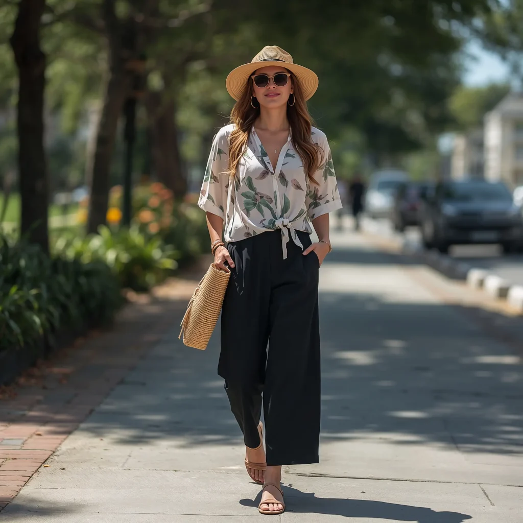 My summer formula involves a cropped white tank or bandeau top (showing just a hint of midriff keeps things balanced), strappy sandals, and oversized sunglasses. The wide leg creates its own breeze when you walk – nature’s air conditioning, if you will.