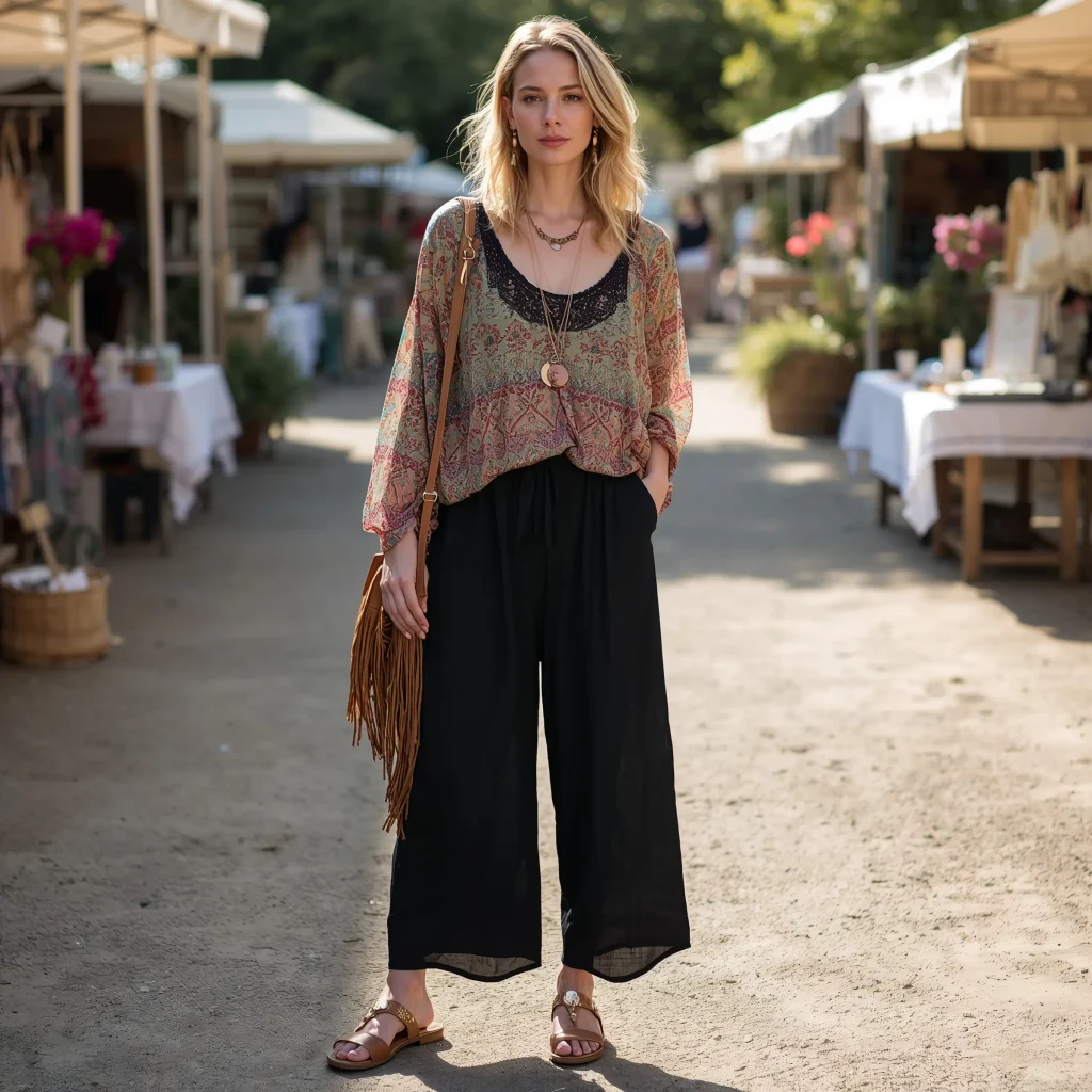 Ever wanted to channel your inner bohemian goddess without looking like you’re heading to Coachella? Black wide leg pants are your answer. They ground the typically flowy, ethereal boho pieces.