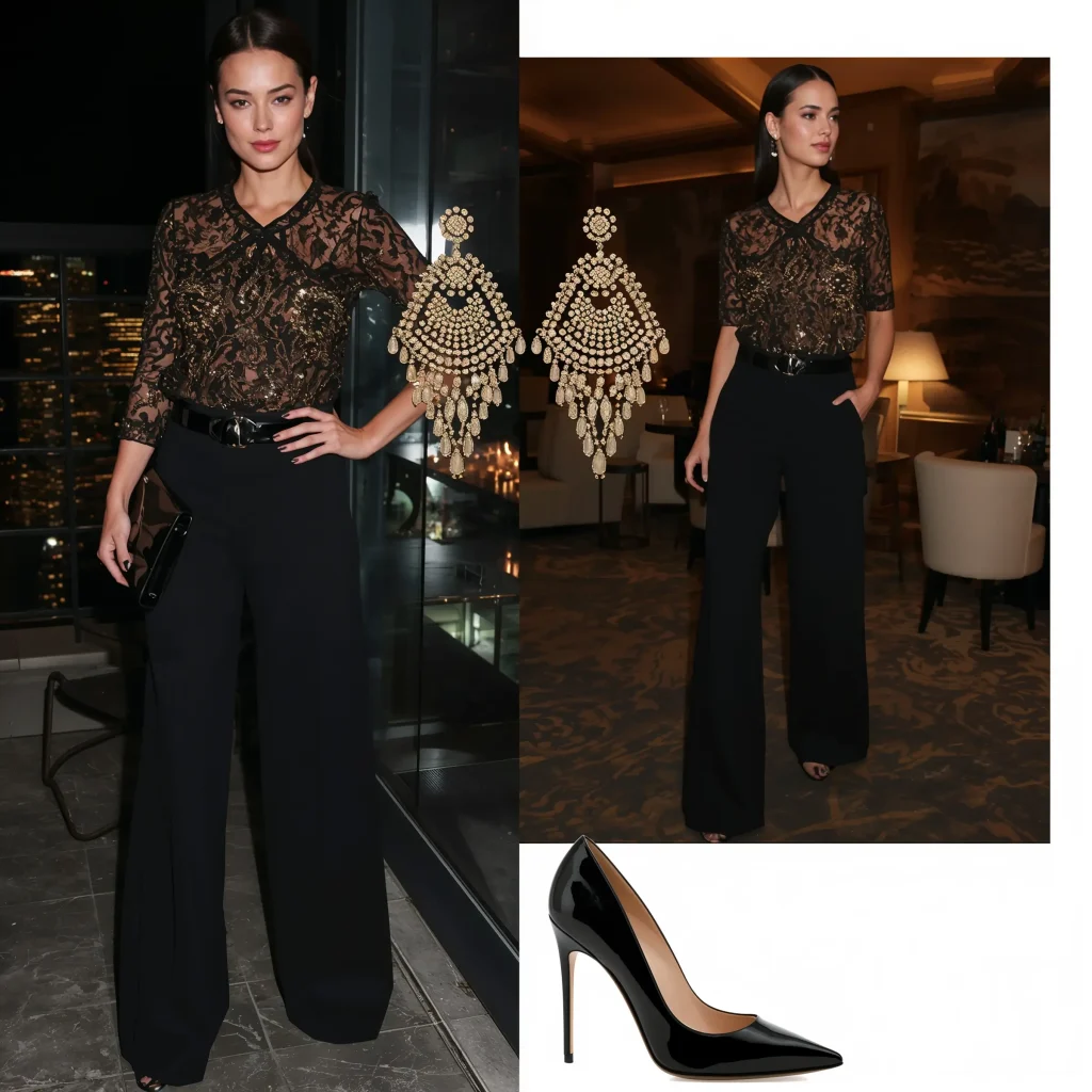 I go all out with a sequined or metallic top, strappy metallic heels, a clutch that could double as a piece of art, and statement jewelry that catches the light. The pants provide the perfect canvas for all the glamour happening up top.