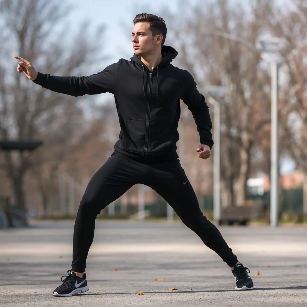 Start with your trusty black zip-up and pair it with joggers or track pants – but not the baggy kind from 2003. We want the modern, tapered fit that shows you understand proportions. Add some running shoes (real ones, not those chunky fashion sneakers), and you’re channeling major athleisure energy.