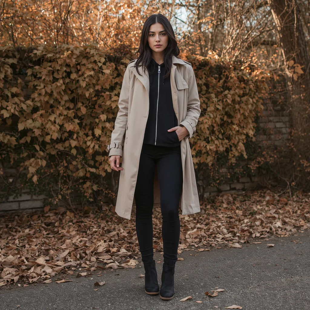 For this look, I go full black everything. Black zip-up, black fitted trousers (not jeans – we’re elevating here), black leather sneakers or Chelsea boots. The trick is playing with different textures and fits to keep things interesting.