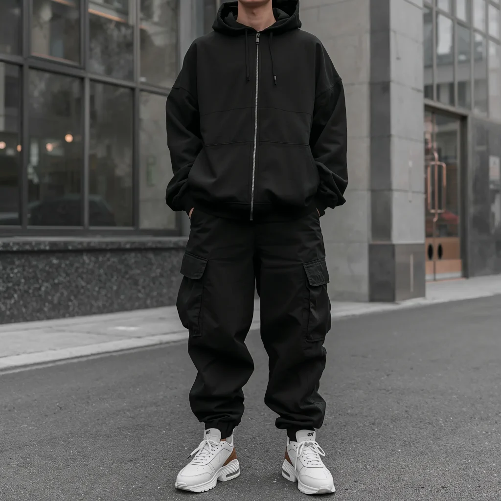 Go up one or two sizes in your black zip-up (but not so big you’re swimming in it). Pair with fitted cargo pants or tapered jeans – the contrast in proportions is crucial here. Add some chunky sneakers (dad shoes are still having their moment), and you’re channeling major street style energy.