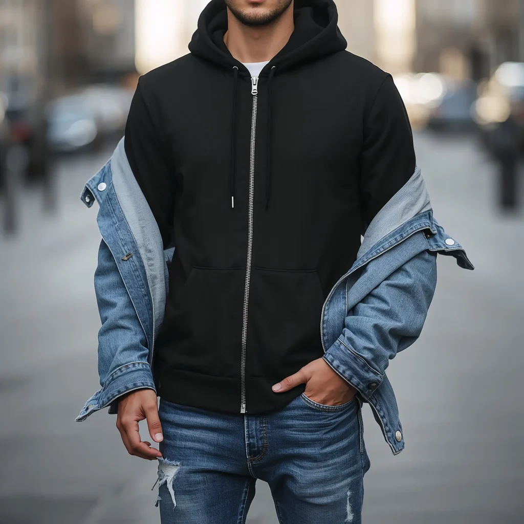 Start with a basic tee, add your black zip-up, then throw a denim or bomber jacket over the whole thing. The hoodie hood peeking out from under the jacket? Chef’s kiss. Pair with dark chinos or jeans, and finish with some boots – could be Timberlands, could be Docs, whatever matches your vibe.