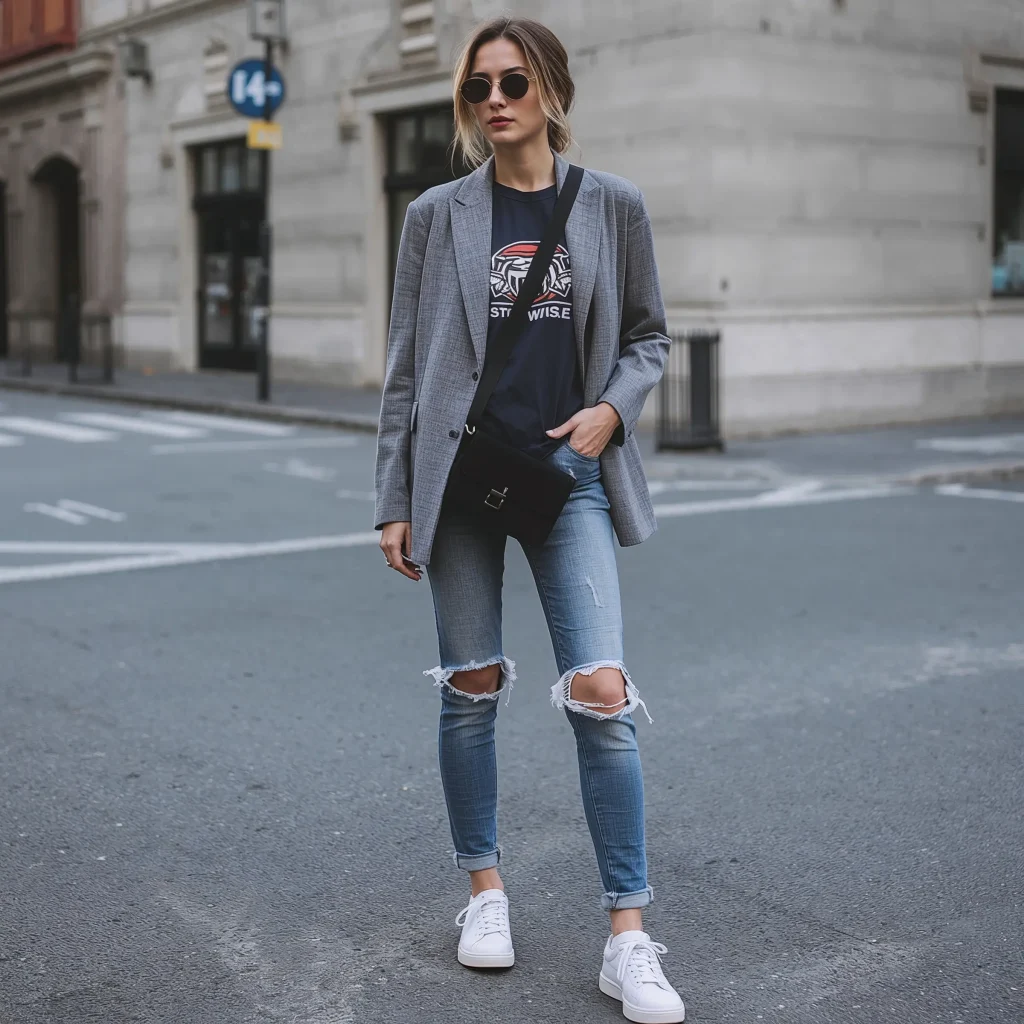 Casual Blazer with Graphic Tee and Sneakers