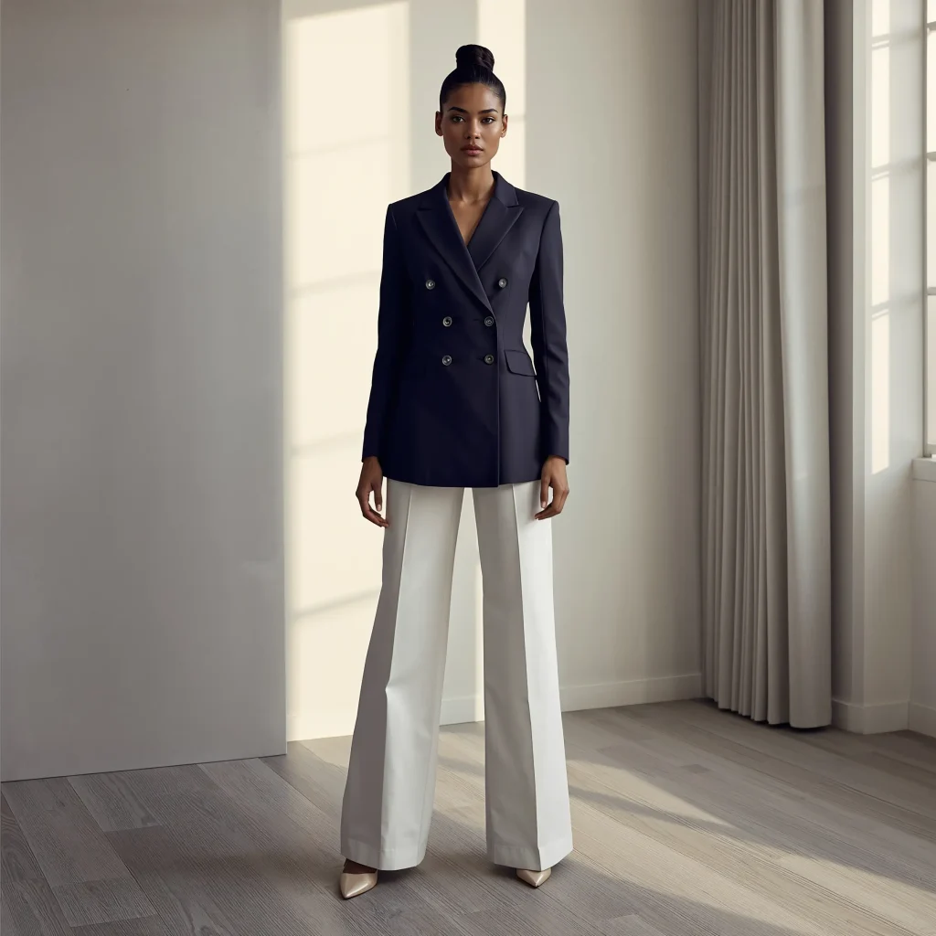 Can we acknowledge that double-breasted blazers make everyone look like they mean business? There’s something about those extra buttons that commands respect. Pair them with wide-leg trousers, and you’ve got an outfit that says “I own three properties and my investment portfolio is diversified.”