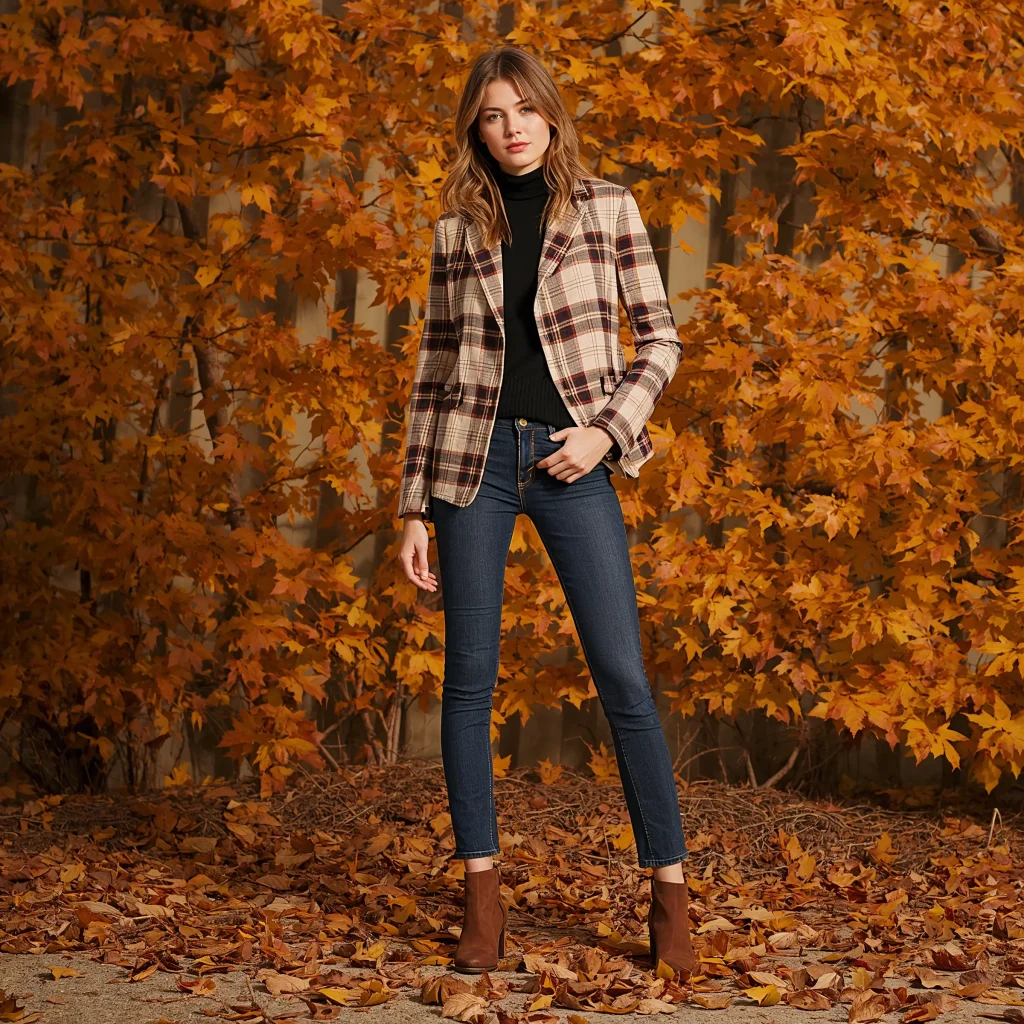Solid bottoms let the blazer shine. Dark denim, corduroys, or wool trousers all complement plaid beautifully. Add leather accessories – brown riding boots, a cognac bag – to complete that autumnal aesthetic.