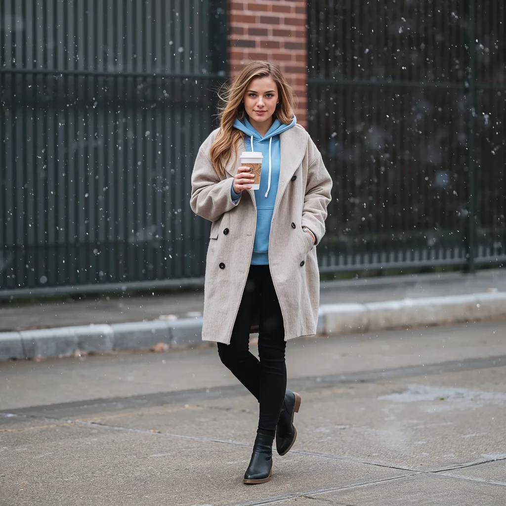 What really makes this work is playing with lengths. Let your hoodie extend slightly beyond your coat hem. This creates visual layers that fashion editors love to call “intentional styling” – fancy words for looking like you know what you’re doing 🙂