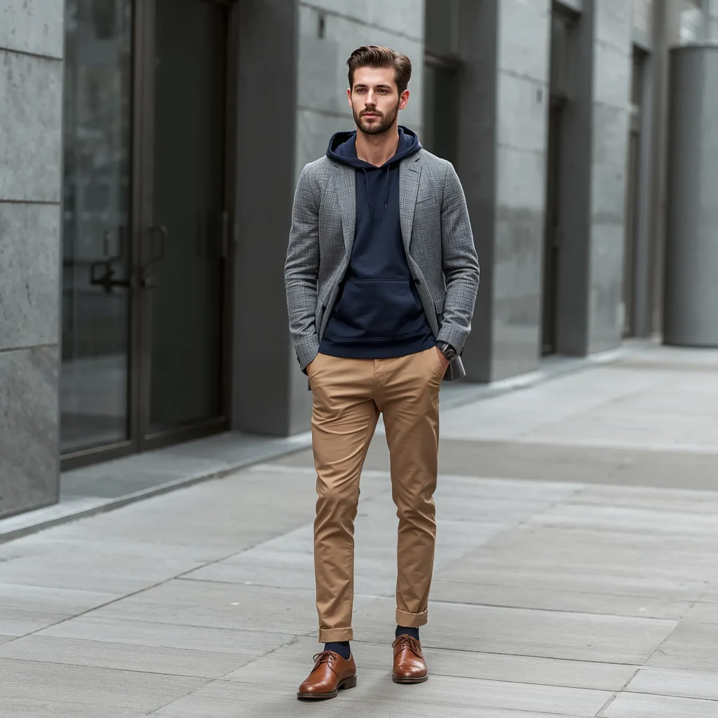 Pick a hoodie in a deeper blue shade for this look. Navy or midnight blue reads more professional than bright cobalt. And please, make sure your hoodie is wrinkle-free. Nothing kills smart-casual faster than looking like you slept in your clothes.