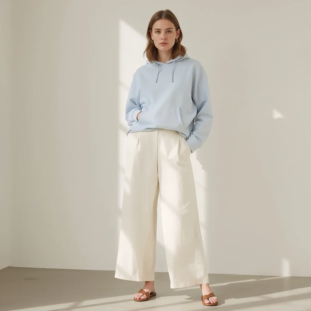 This style works because the blue hoodie becomes your statement piece. Everything else supports without competing. I live in this combination during transitional seasons when I want to look pulled together without overthinking.