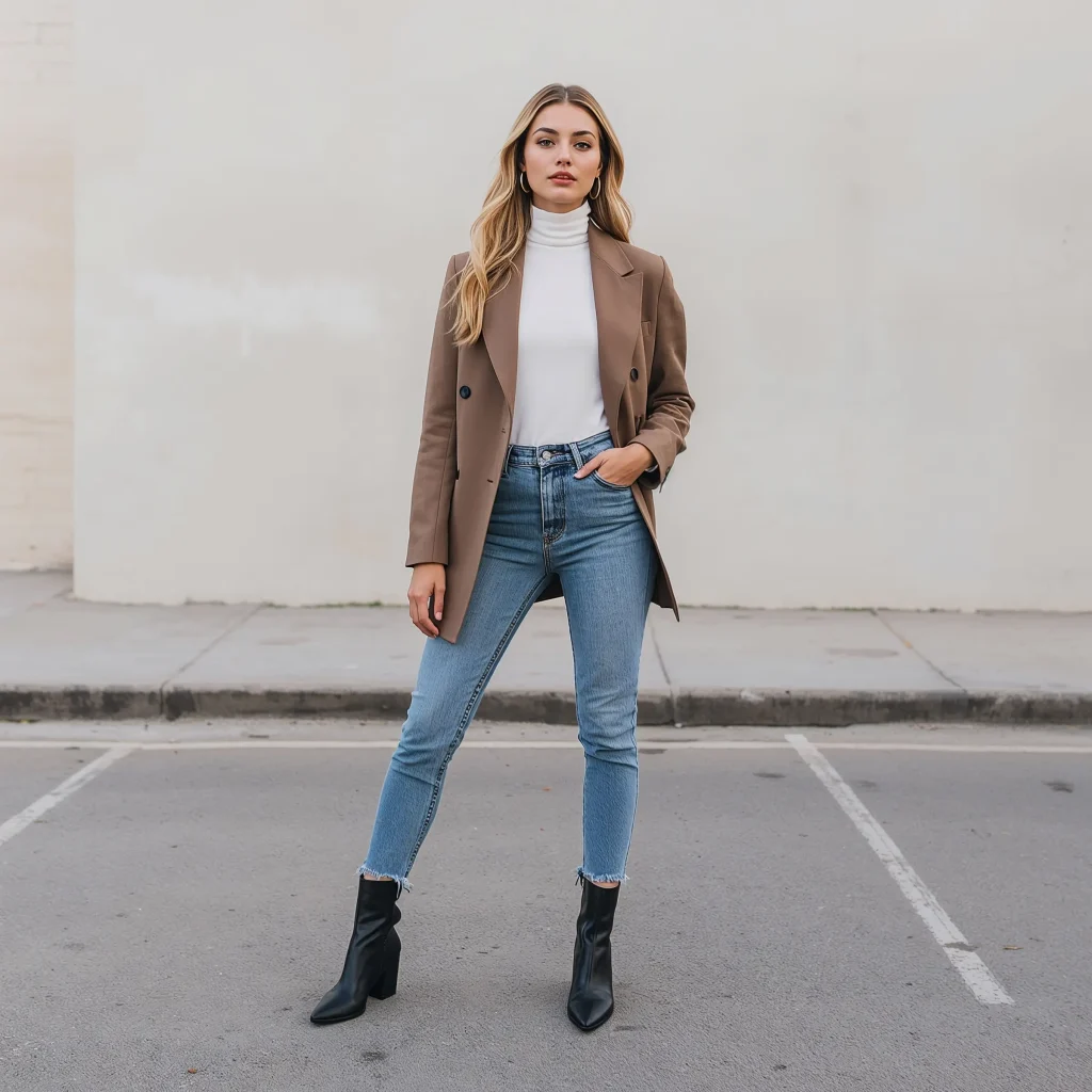 Start with a crisp white turtleneck β and please, make sure it actually fits well around your neck. Nobody wants that saggy turtleneck situation happening. Pair it with your favorite jeans (I personally love straight-leg or slightly flared ones), and throw on that brown blazer like you own the place.