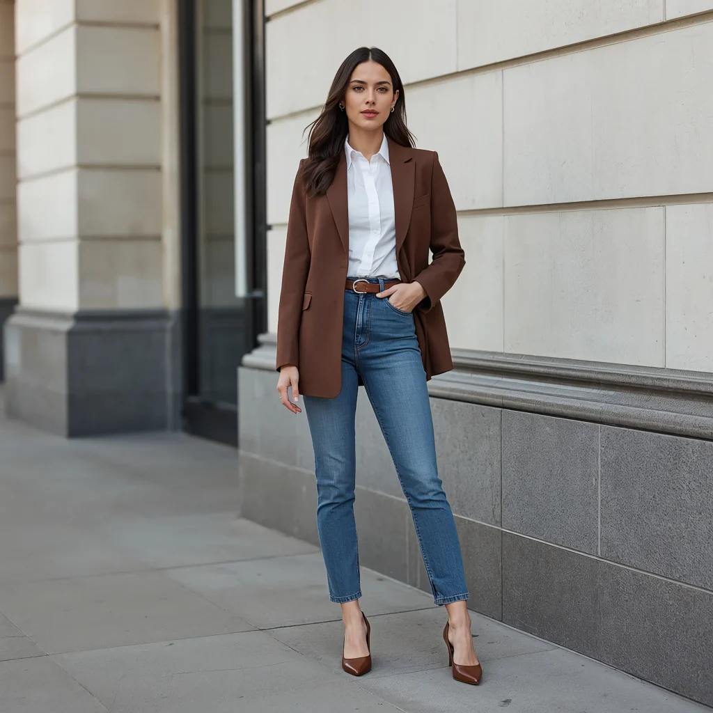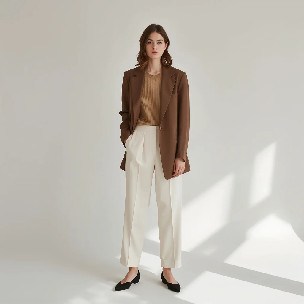 I love wearing slim-fit black trousers with a slightly oversized brown blazer. It creates this amazing contrast between fitted and relaxed that looks intentional rather than “I grabbed the wrong blazer this morning.” Add a simple white or cream blouse underneath, and you’re golden.