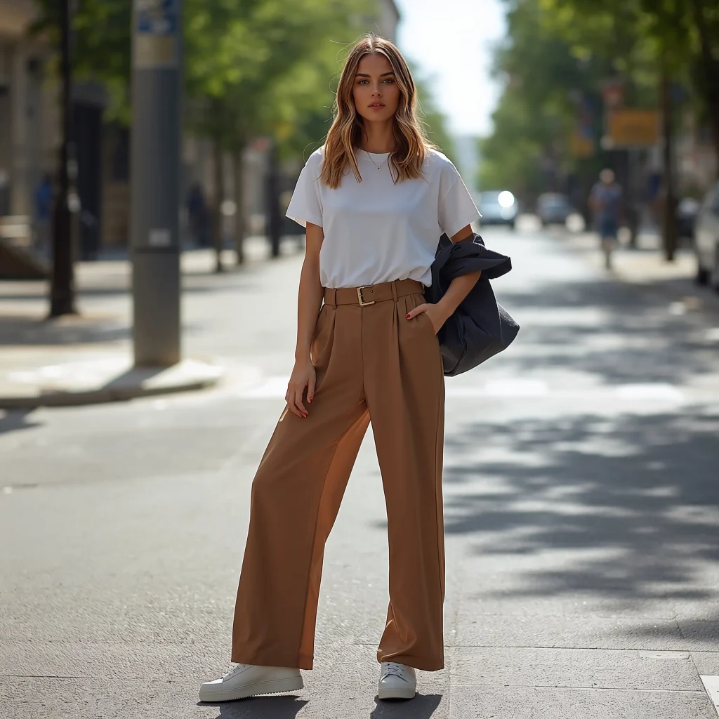 1. Casual Chic Brown Wide Leg Pants with White Tee