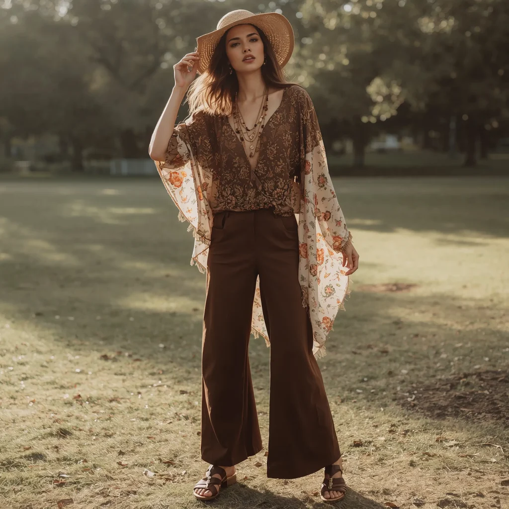 3. Boho Vibes Brown Wide Leg Pants with Printed Top