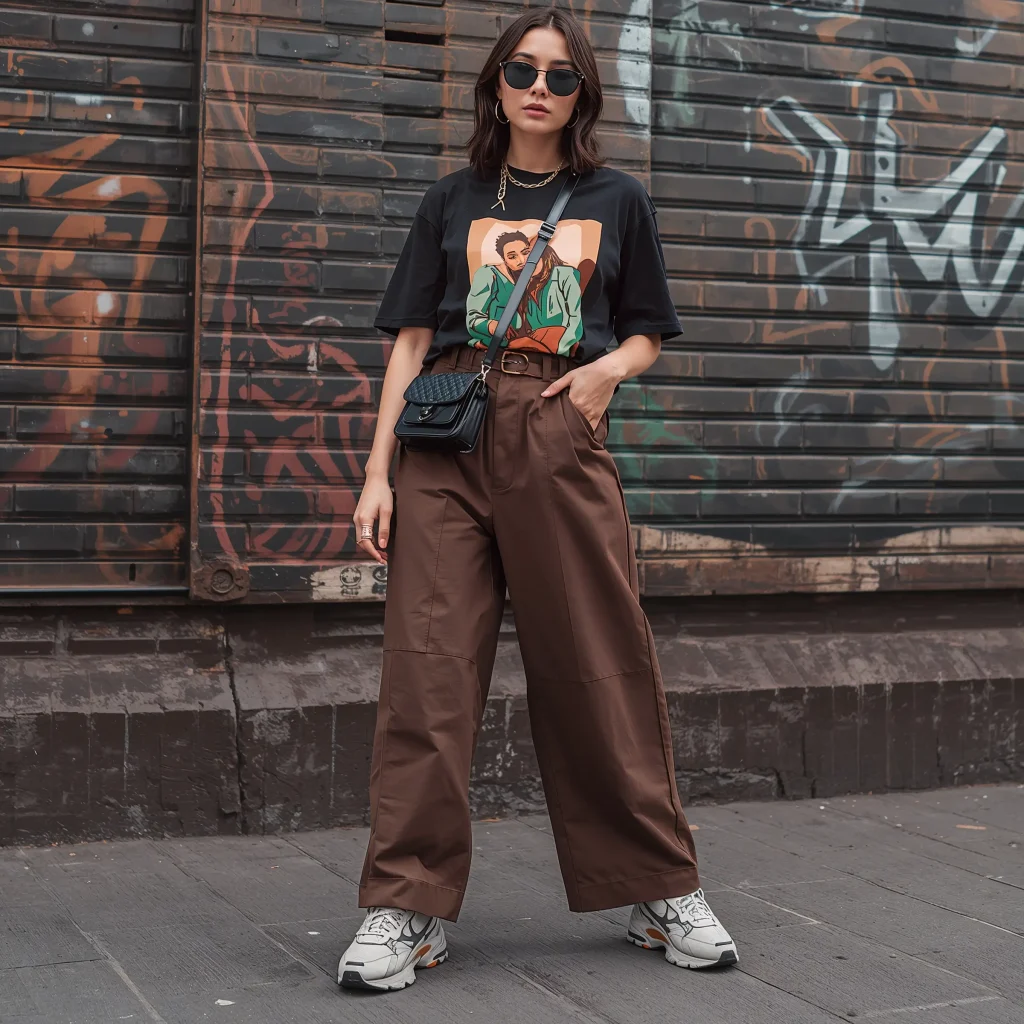 This might be my favorite combination because it’s so unexpectedly cool. Brown wide leg pants with a graphic tee creates this perfect street style moment that says you know fashion but you’re not trying too hard.