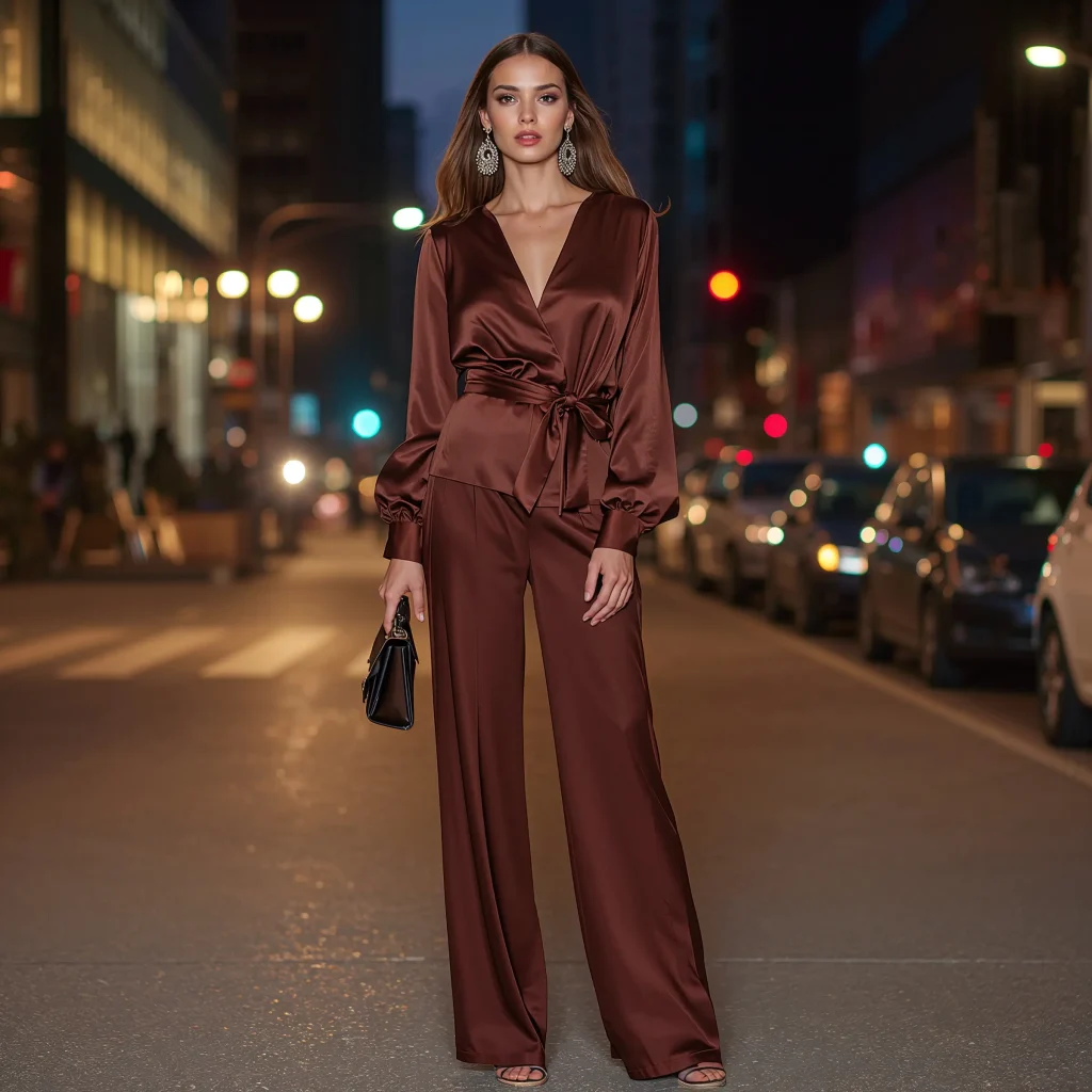 7. Elegant Evening Brown Wide Leg Pants with Silk Blouse