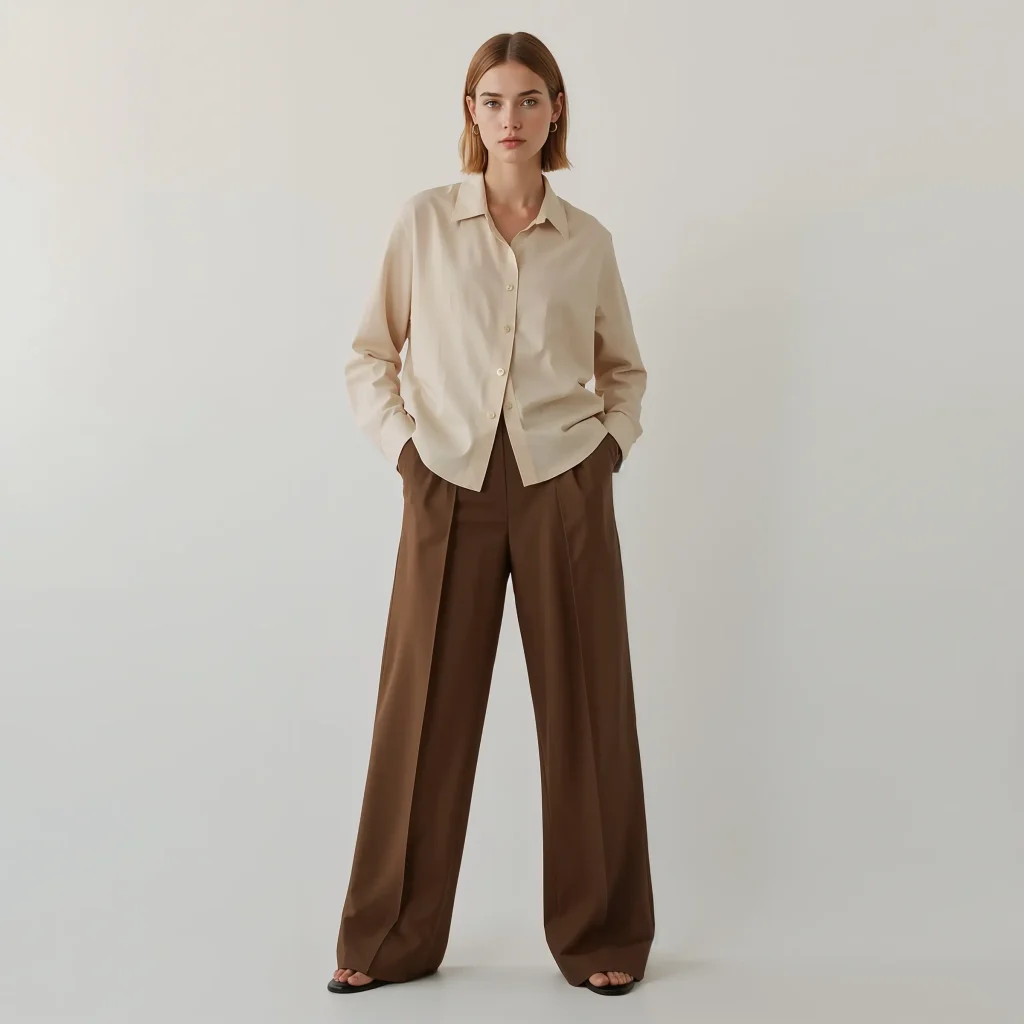 8. Minimalist Brown Wide Leg Pants with Neutral Shirt