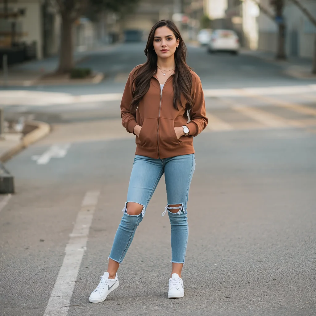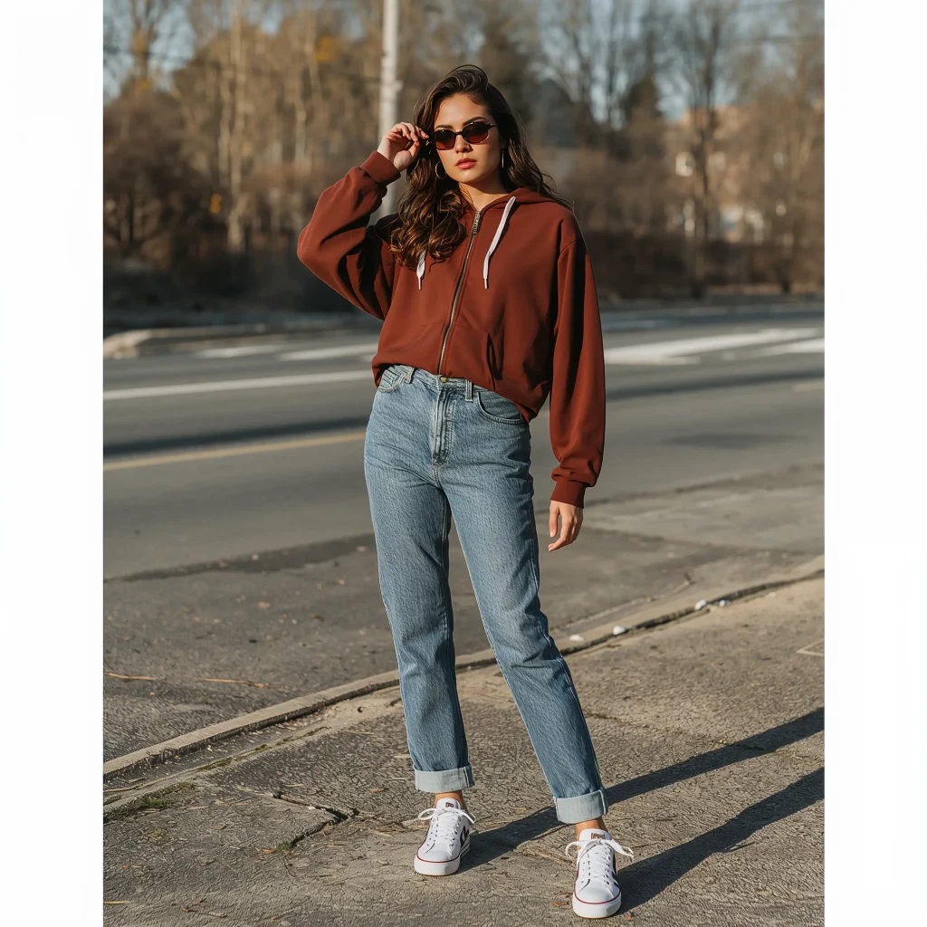 This combo never fails me. I pair my brown zip up hoodie with classic blue jeans, and suddenly I look like I actually tried getting dressed in the morning. The beauty here lies in the contrast – the earthy brown plays perfectly against denim blue, creating visual interest without any effort.