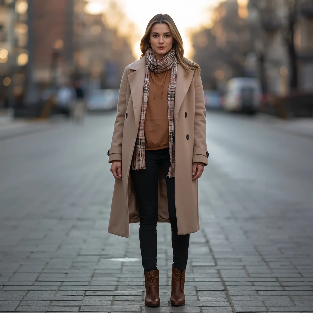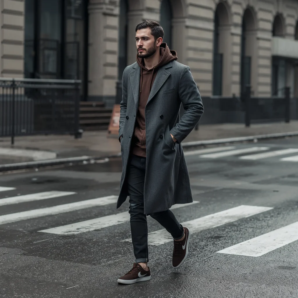 Choose a structured wool coat or trench coat in black, gray, or camel. Your brown hoodie sits underneath, fully zipped for a clean neckline. Pair with dark jeans or tailored trousers and leather boots. The contrast between casual and formal creates that coveted “effortlessly chic” look everyone’s after.