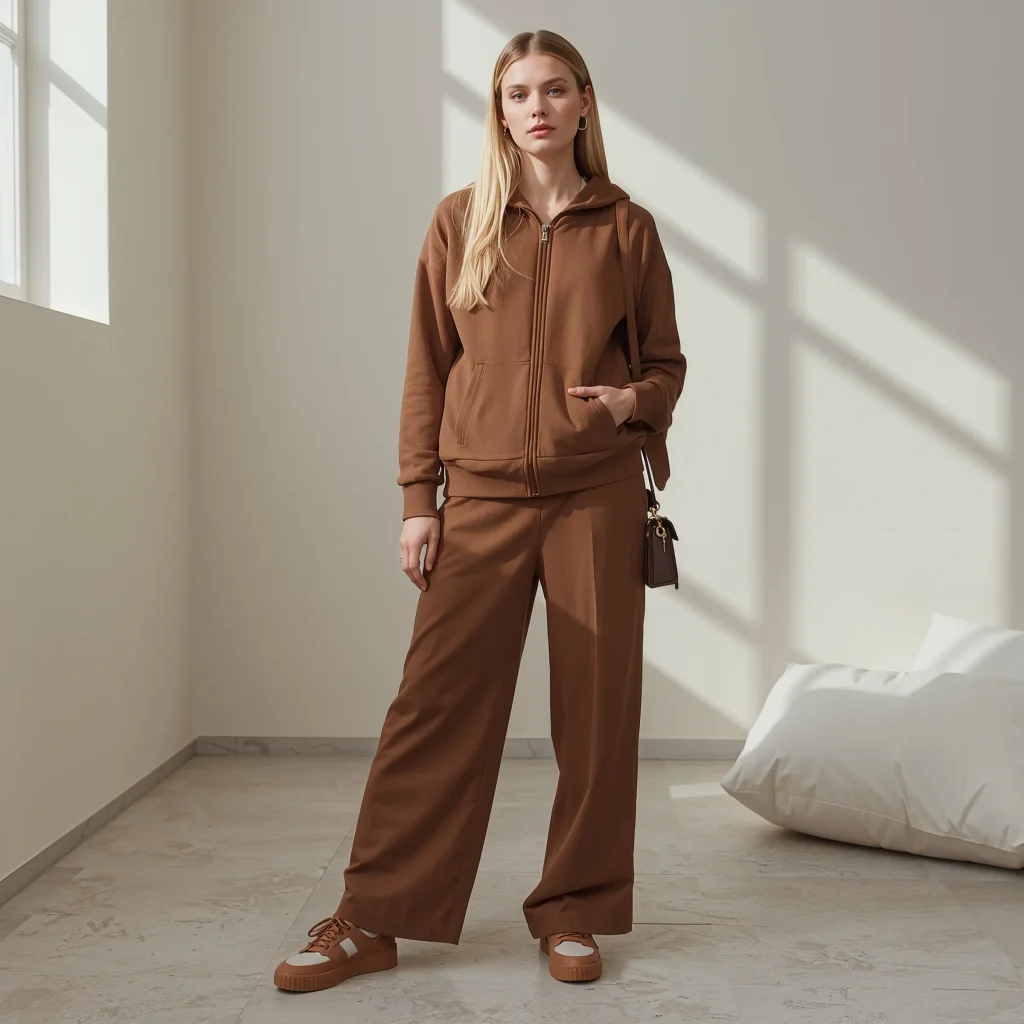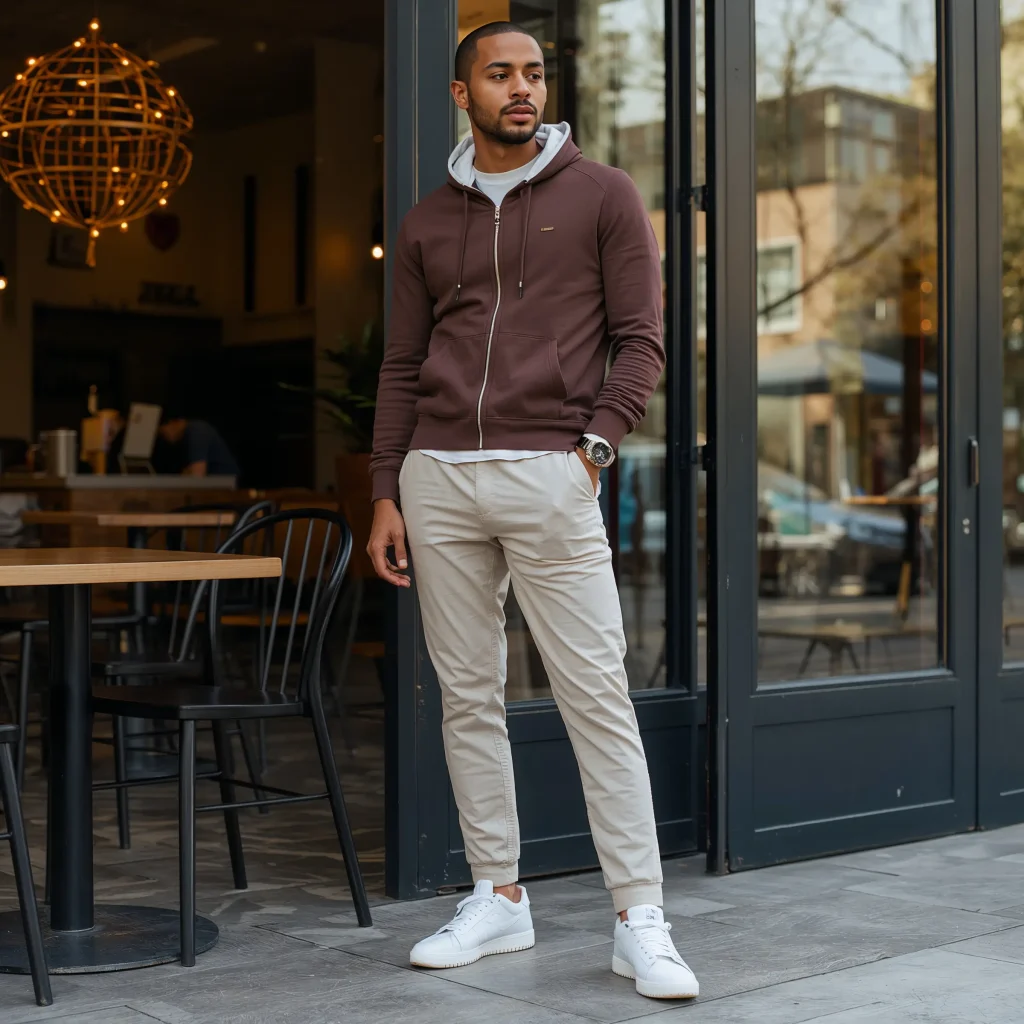 Start with cream or white pants (yes, even after Labor Day). Add your brown hoodie over a white or gray tee. White minimalist sneakers tie everything together. The beauty of this look? Every piece gets its moment to shine because nothing competes for attention.