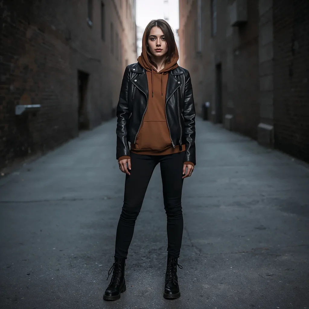 I wear slim-fit black jeans with this combo, creating a streamlined silhouette that balances the bulk of two upper layers. Combat boots or Chelsea boots complete the vibe perfectly. Leave your hoodie slightly unzipped and push the sleeves up a bit to show off the leather jacket’s details.