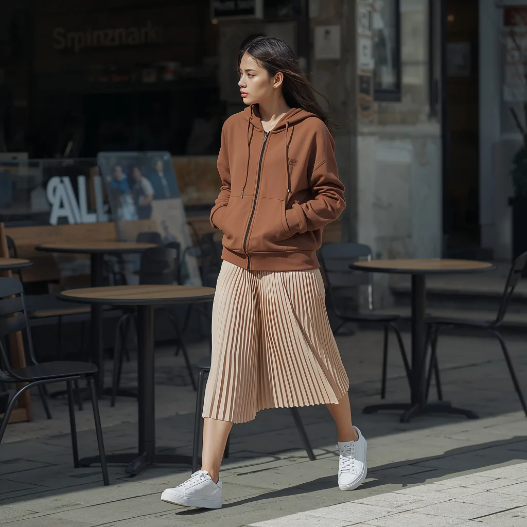 Choose a skirt in a neutral tone – black, cream, or even a subtle pattern works here. The hoodie adds casual balance to the skirt’s formality. White sneakers or ankle boots complete this perfectly balanced outfit. Leave the hoodie partially unzipped with a simple tee or tank underneath.
