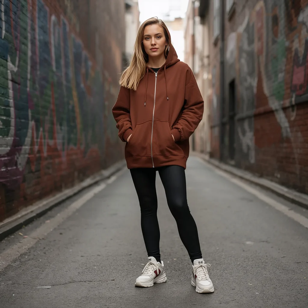 IMO, oversized hoodies deserve their own category because they change the entire silhouette game. If your brown zip up runs large, lean into it! Create balance by pairing with fitted bottoms like skinny jeans or leggings.