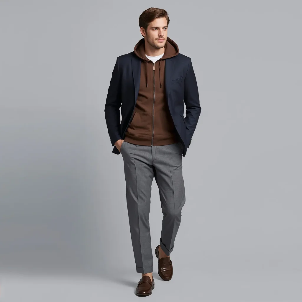 Wear a button-down shirt underneath – white or light blue works best. Add dark chinos or dress pants and leather dress shoes or clean minimalist sneakers. Keep the hoodie unzipped to show that collar, and make sure everything fits properly. No oversized pieces here!