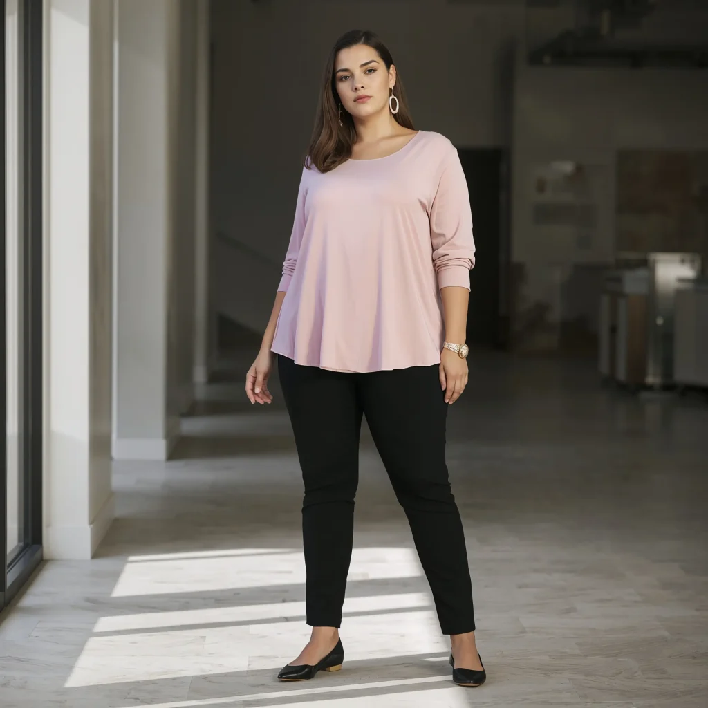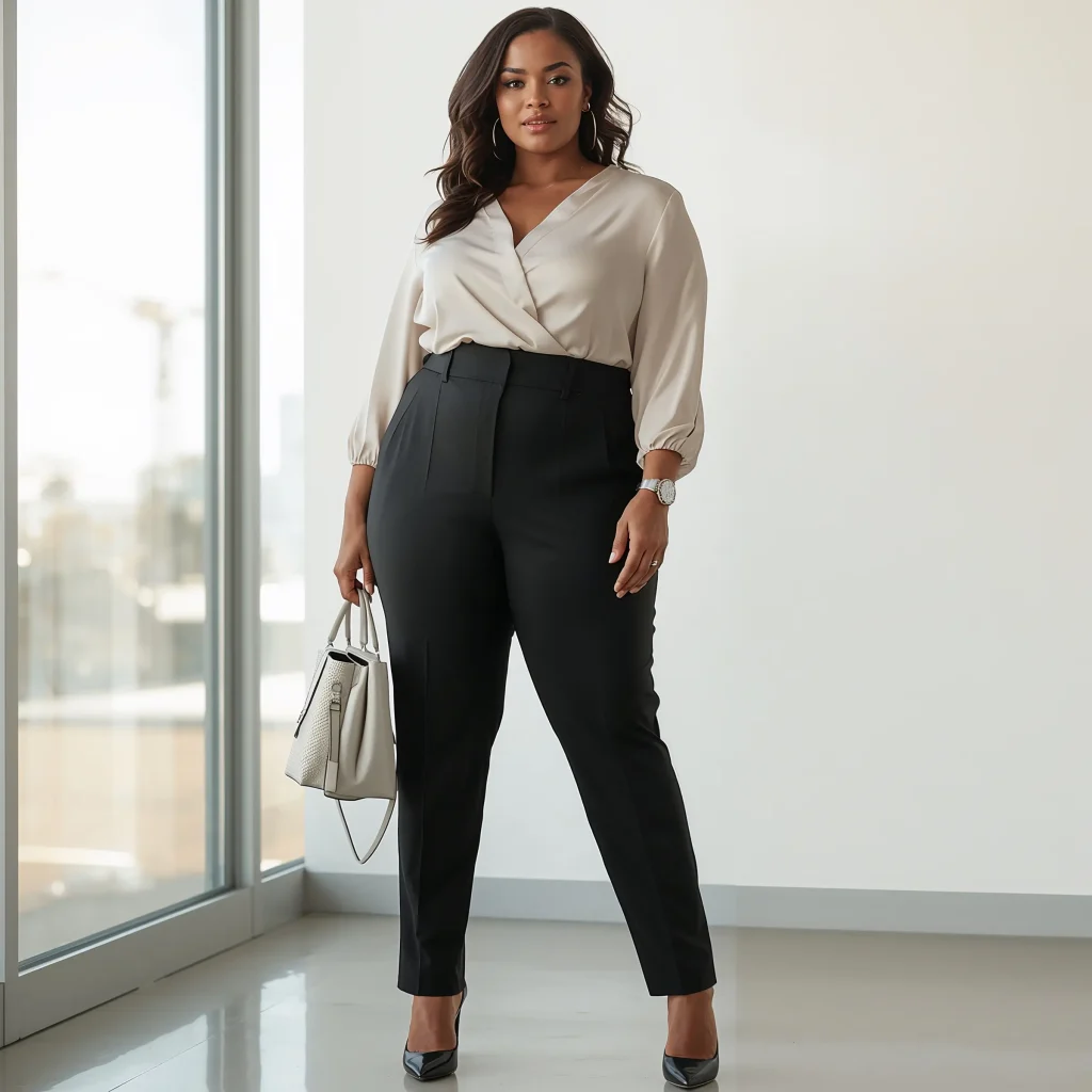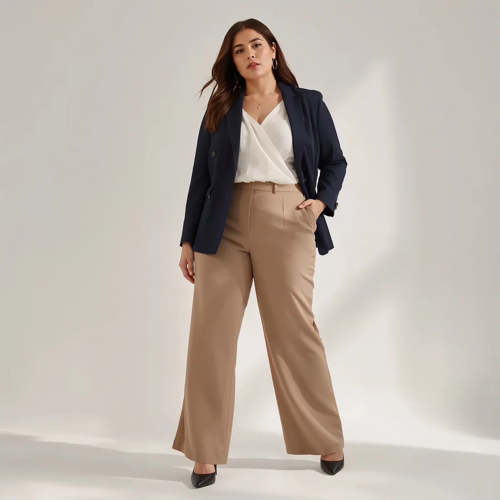 Wide-leg pants are basically magic for us curvy ladies. They create this gorgeous, elongating line from hip to floor that makes you look like you own the place (even if you’re just heading to the copy machine). Choose pants with a high waist that sits comfortably at your natural waistline. This creates the perfect canvas for tucking in blouses or leaving your blazer open for a more relaxed vibe.