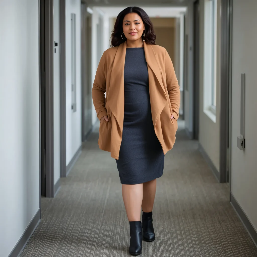 A tailored dress provides the perfect foundation for this look. Think sheath dresses, wrap dresses, or A-line styles that skim your curves without clinging. The dress should fit well enough to stand alone, because let’s be real – that office gets hot by 2 PM, and you’ll want to shed that cardigan.