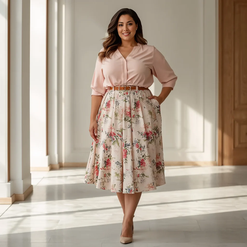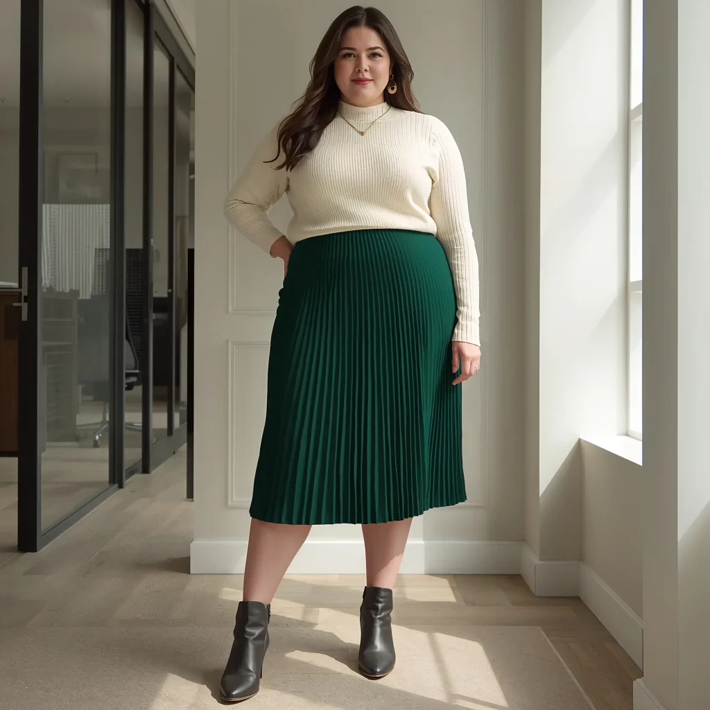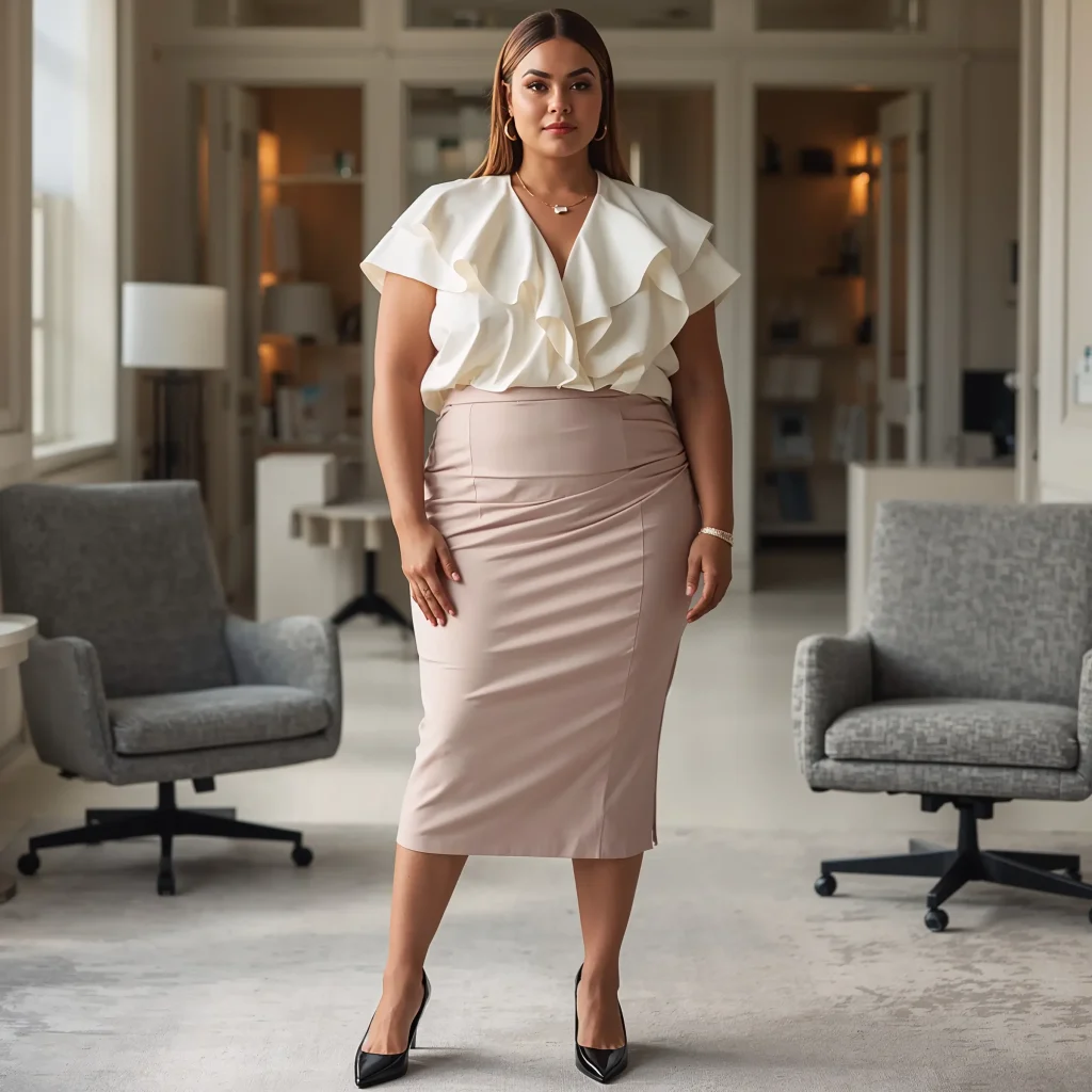 Start with a well-fitting midi skirt in a neutral color. The skirt should sit at your natural waist and fall to mid-calf. This length works magic on curvy figures, creating an elegant line that’s appropriate for any office setting.
