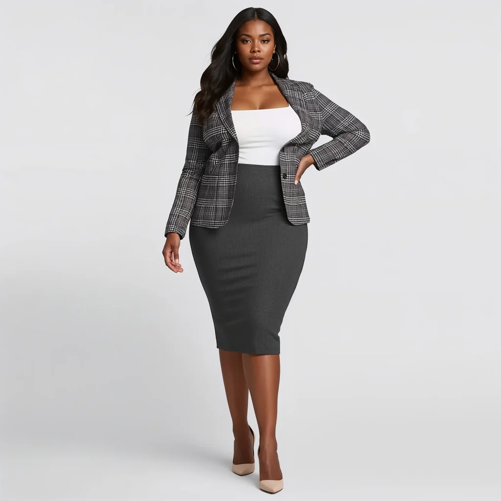 Whoever decided pencil skirts were only for one body type clearly never saw a curvy woman rock this look properly. Paired with a patterned blazer, this outfit screams “corner office energy.”