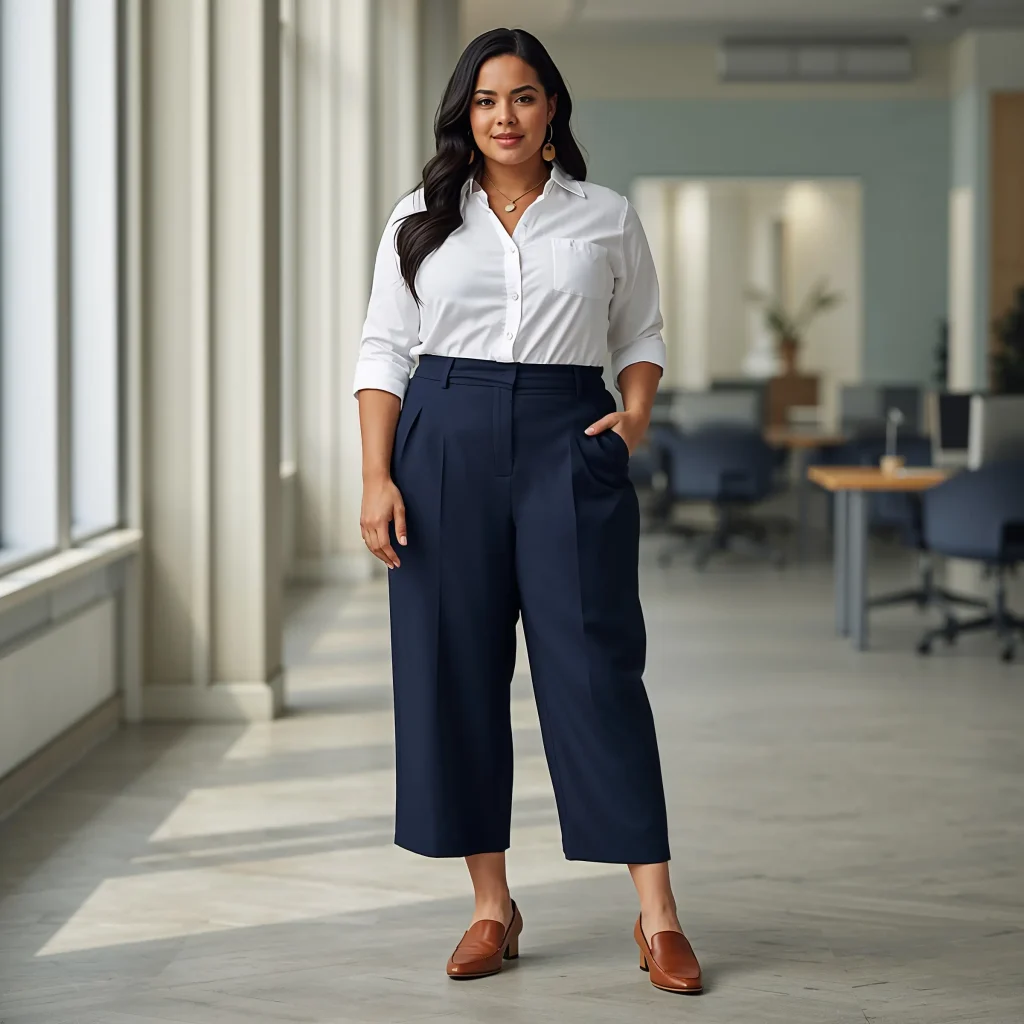 Culottes are basically the best-kept secret in plus size business casual. They look like a skirt from afar but give you the freedom of pants. Revolutionary? Maybe not. Game-changing for your workday comfort? Absolutely.