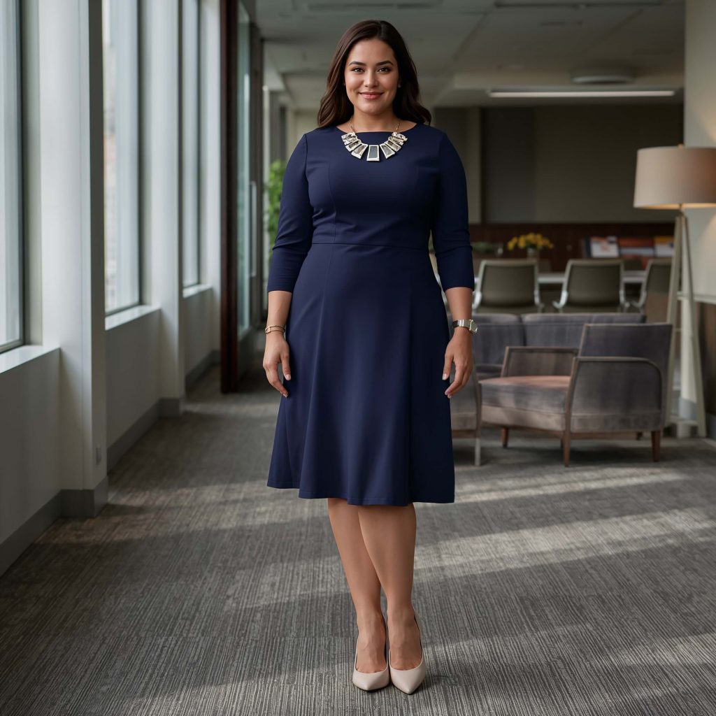 Sometimes the simplest outfit formula creates the biggest impact. An A-line dress with a statement necklace proves you don’t need complicated layering to look professionally polished.