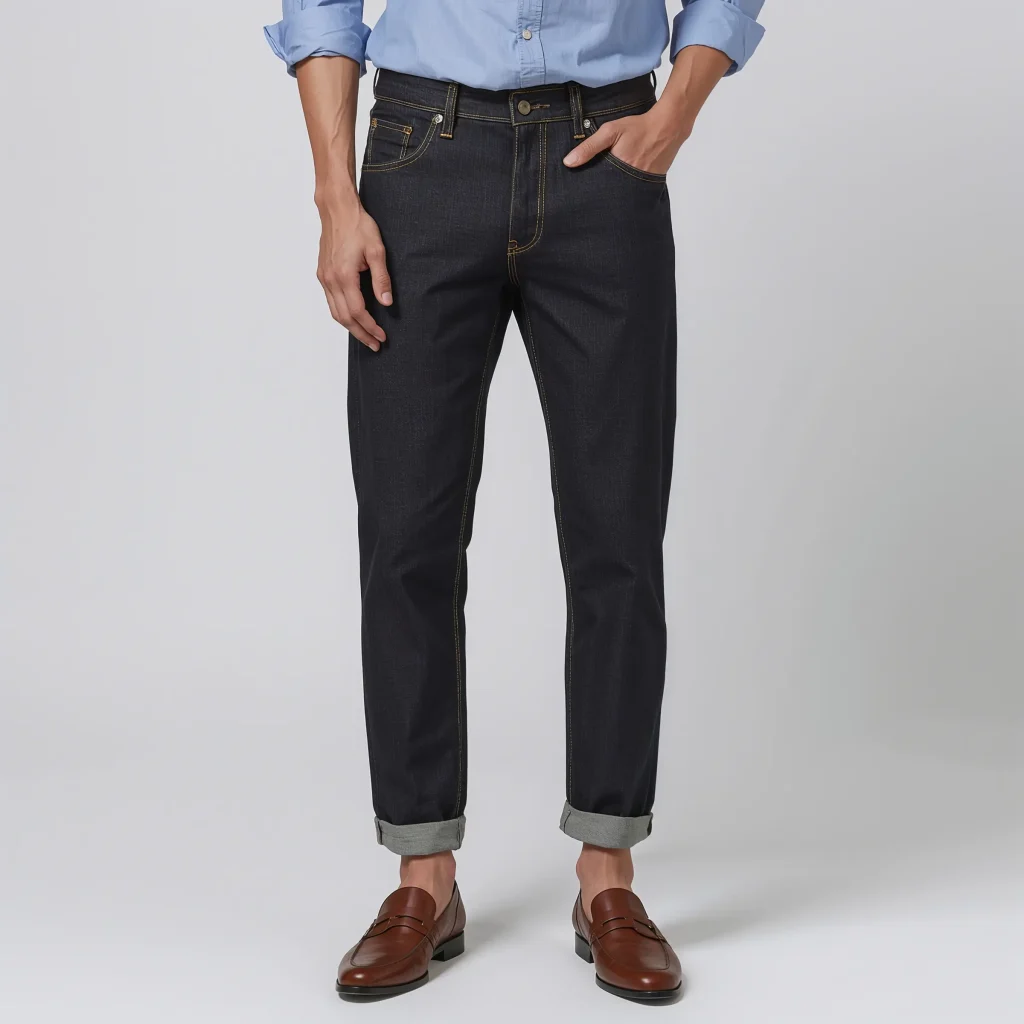 The roll is crucial here – we’re not going for massive cuffs that scream “flood incoming.” Just a subtle 1-2 inch cuff that shows off your ankles and your killer shoe game. I usually go for mid-rise straight-leg jeans for this look because they roll beautifully without creating bulk.