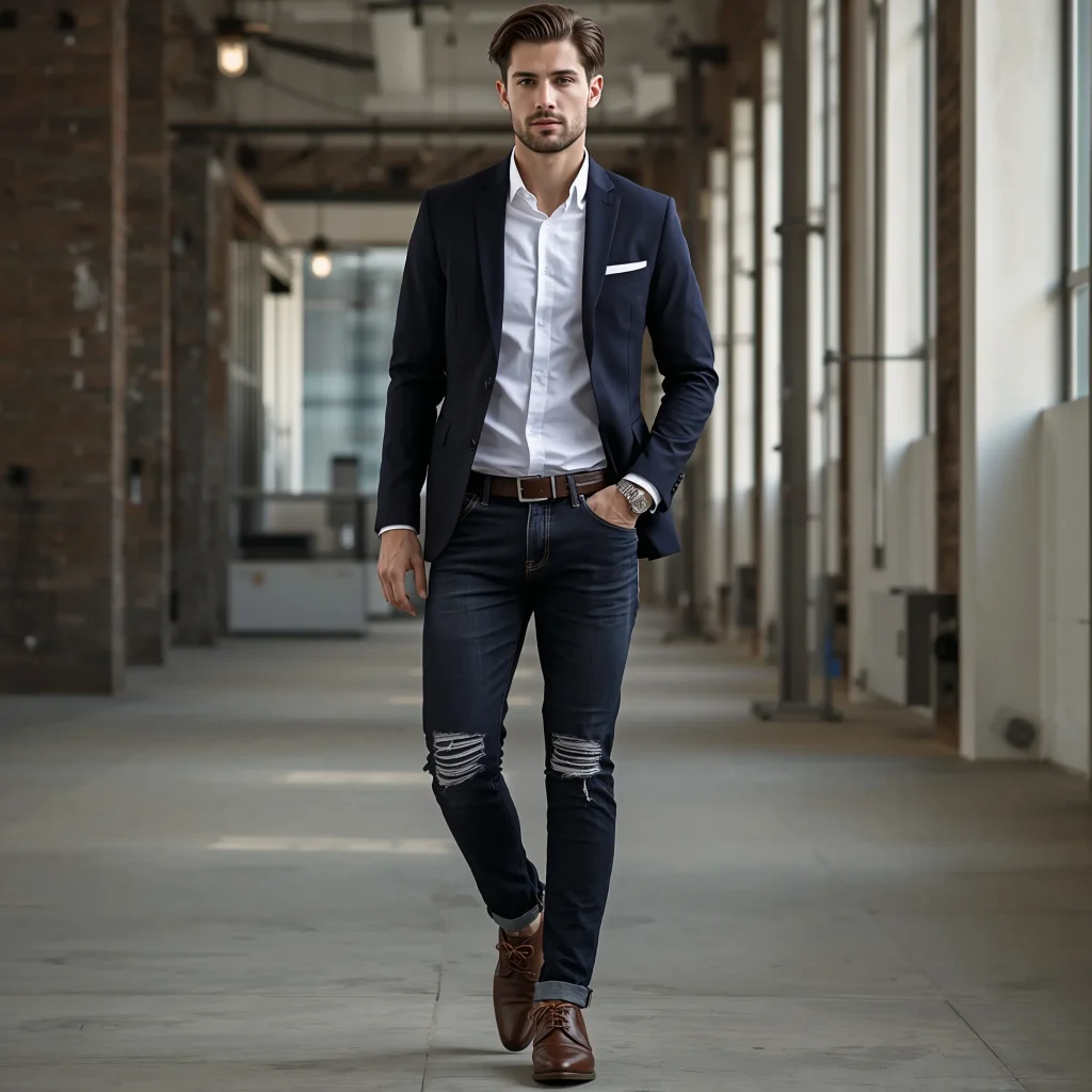 Okay, hear me out on this one. Distressed jeans in the office? It can work, but you need to be strategic. We’re talking minimal distressing – maybe a slight knee rip or some subtle fraying, not jeans that look like they survived a zombie apocalypse.