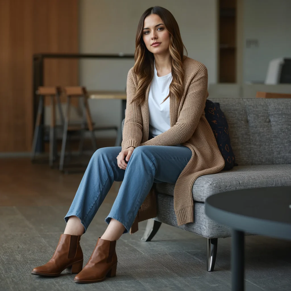 The cardigan has officially transcended librarian status and become a legitimate style staple. When you pair it with jeans and ankle boots, you get this cozy-yet-professional vibe that’s perfect for transitional weather.