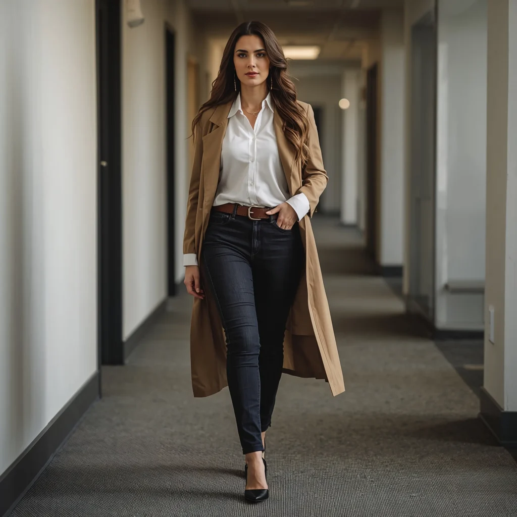 This combo is basically the Swiss Army knife of office outfits. I swear, dark wash jeans paired with a crisp white button-up has saved me more times than I can count. You know those mornings when you’re running late and need something foolproof? This is it.