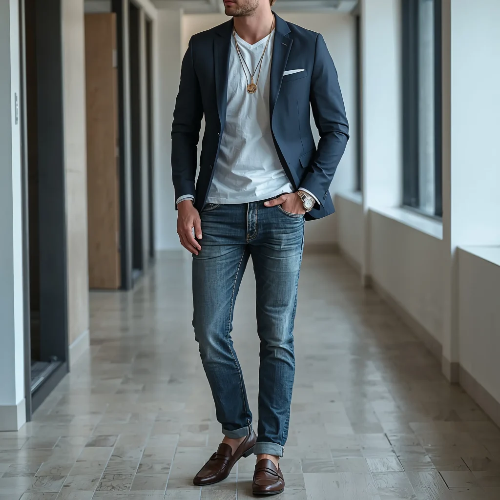 A casual blazer – think linen, cotton, or a relaxed wool blend – creates the perfect balance. The blazer adds structure while the light jeans keep things approachable. I love this combination for creative offices or casual Fridays when you want to look pulled together but not overly formal.