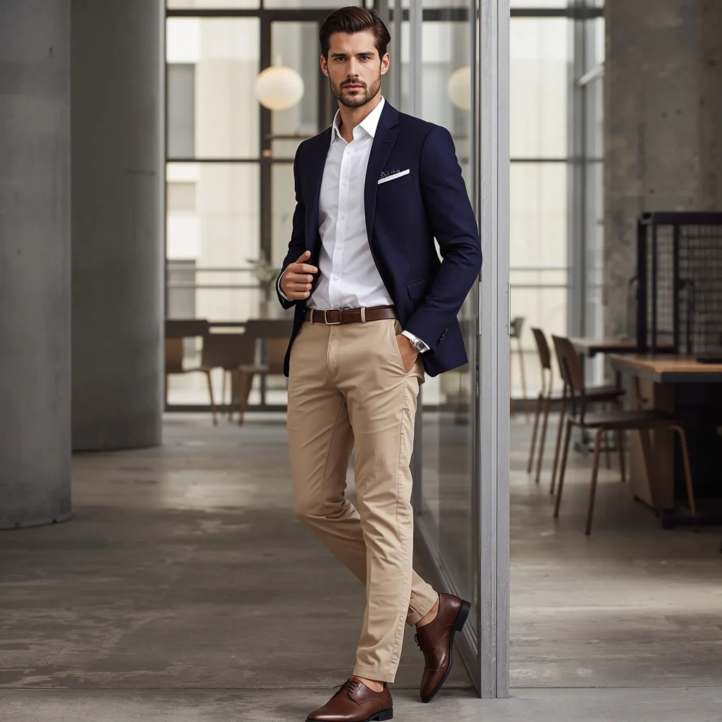 Start with a navy blazer (if you don’t own one, seriously, what are you waiting for?) and pair it with khaki or beige chinos. Throw on a white or light blue button-down shirt underneath, and you’ve got yourself an outfit that screams “I have my life together” without being stuffy. The key here is fit – your blazer should hug your shoulders perfectly, and those chinos shouldn’t look like parachute pants from the ’90s.