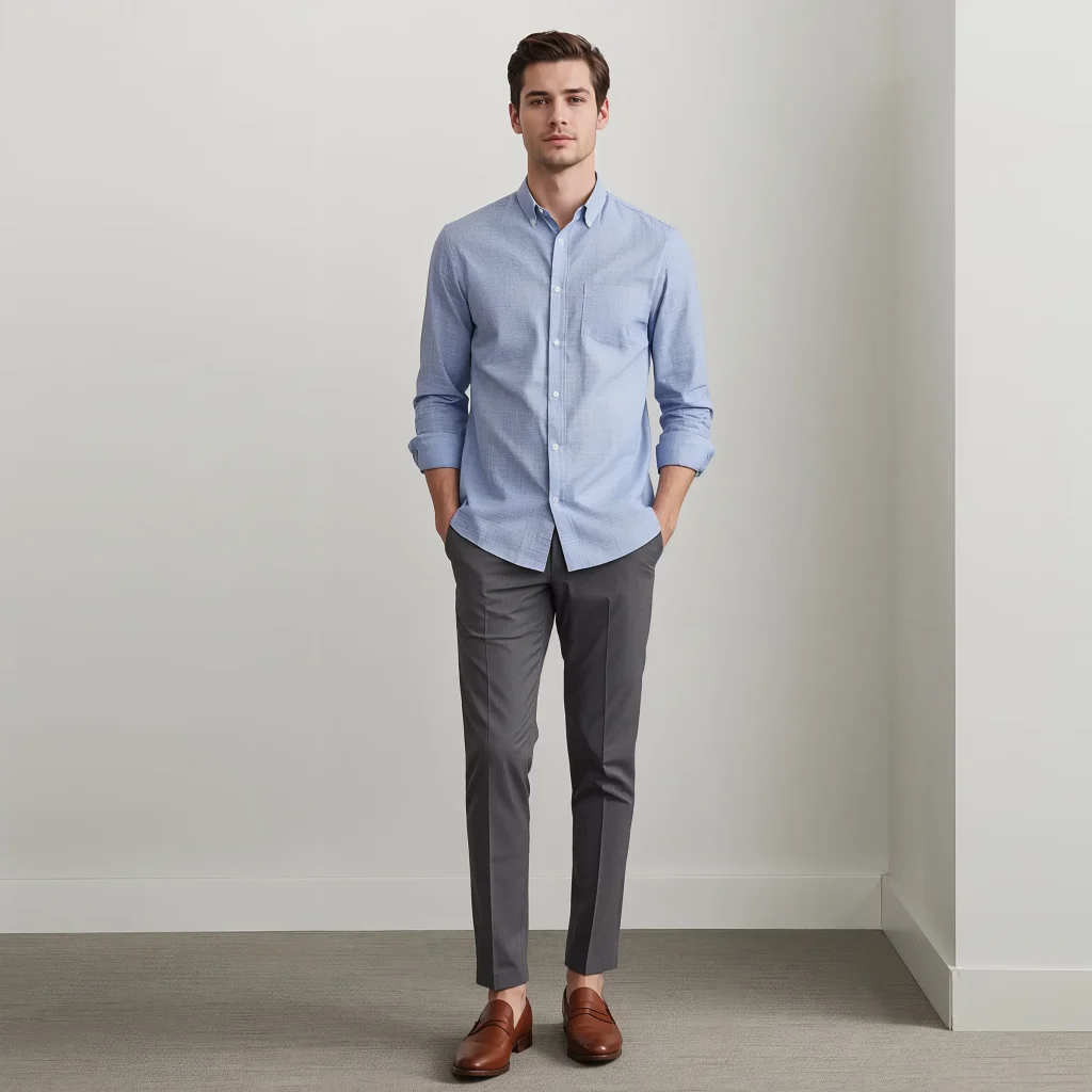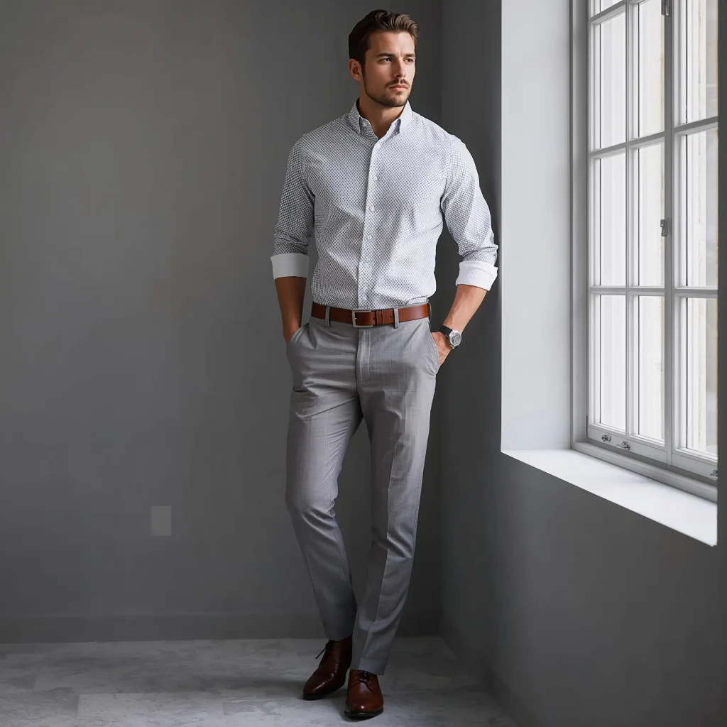 The trick? Choose shirts with interesting textures or subtle patterns. A light blue chambray shirt with charcoal grey trousers creates this effortlessly cool look that says you understand fashion without obsessing over it. Make sure those trousers hit right at your ankle – no pooling fabric around your shoes, please.