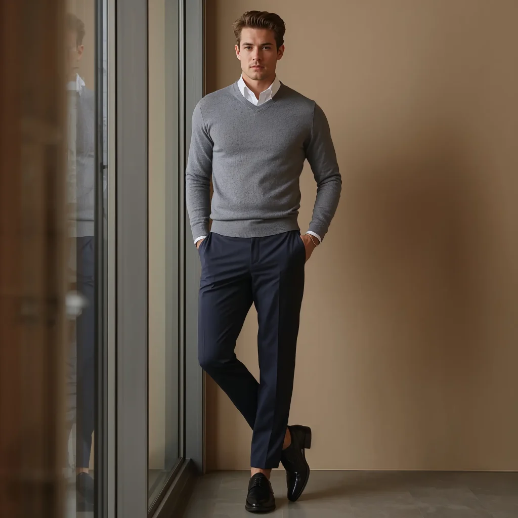 Start with a crisp white or blue Oxford shirt, then layer a crew neck or V-neck sweater on top. Let about half an inch of collar peek out – it adds structure and prevents you from looking like you just threw on whatever was clean. Grey, navy, and burgundy sweaters are your best friends here.