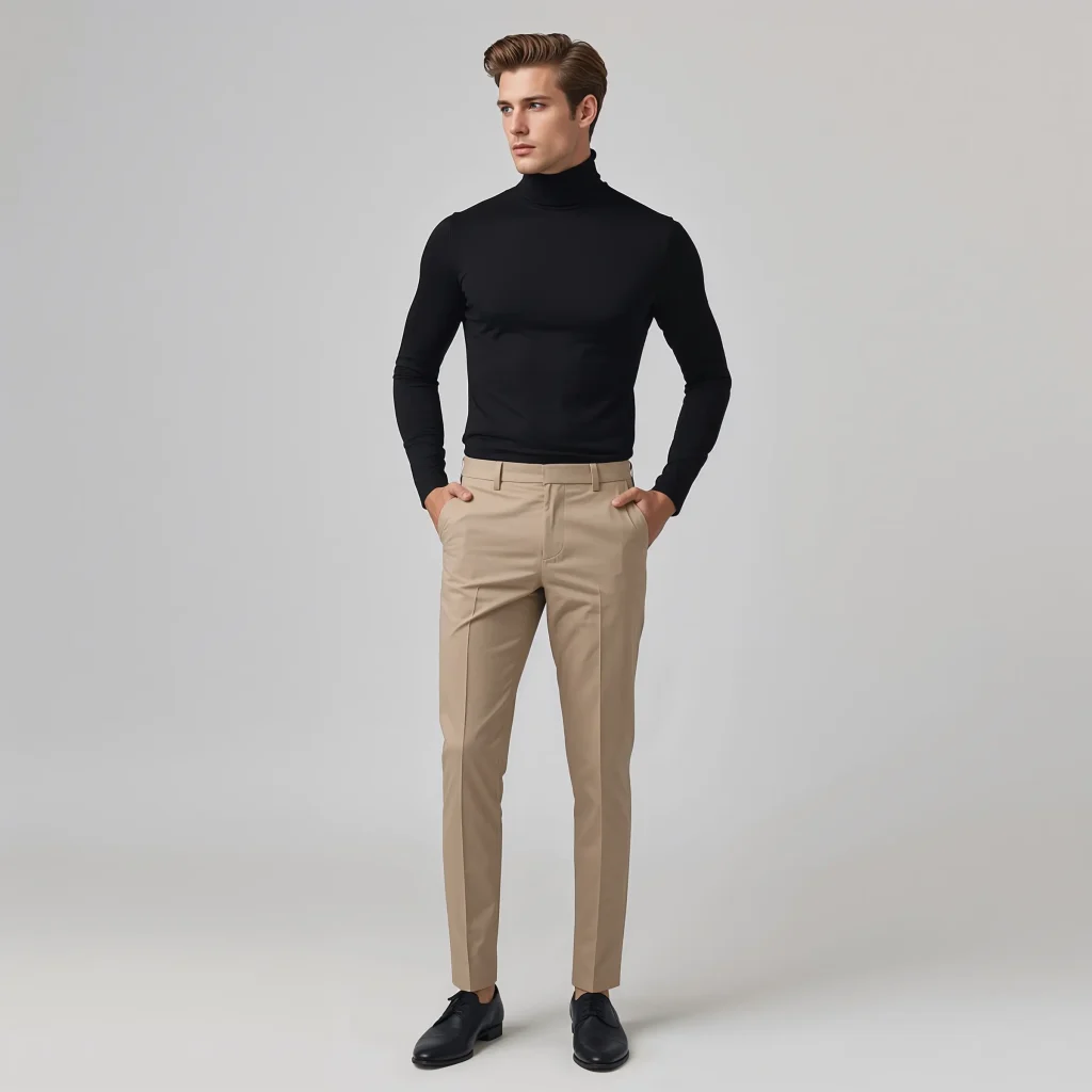 Black turtleneck with grey slacks? Classic. Navy turtleneck with khaki pants? Nautical and sharp. The beauty of this outfit is its simplicity – no worrying about collar placement or tie knots. Just pull it on and go.
